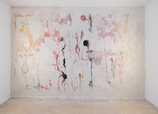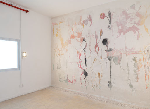 2025 "Motions" Solo Exhibition Parterre Projects Curator: Keren Yaela Golan Almost imperceptibly, a crack, an opening appears, and a little indulgence springs out to announce a new beginning. Katrin Tolkovsky's fantastical world revolves around purification and rejuvenation through processes of fragmentation and engraving. In her first solo exhibition, the artist combines diverse media (painting, video, sculpture, and sound), manifesting a remarkable synthesis of touch and expression. Katrin uses the traditional sgraffito technique – applying layers of plaster and paint and scratching the top layer while it's still wet – to expose contrasting layers of material and color. Tolkovsky paints and plasters the painting recursively. The painting emerges from within the wall, revealing a layer teeming with fractured vitality that transforms into a source of beauty and solace. The canvas – raw and crucified – is nailed to the wall like an organic skin, almost human. It unravels and crumbles, shedding its layers to reveal traces of life that evolve with time. Past and present interweave to form delicate scars of grace and rejuvenation. Her creative process, grounded in destruction and revealment, mirrors an endless pursuit of elusive truth and emerging meaning. Her works navigate between imagery and abstraction, between nature and the imaginary, gravitating toward threshold spaces (strange flora and disembodied organs) and resonating in memory as traces of ancient archetypes. The sound work and music production were designed and composed by Eran Hadar and Ohad Koski. The ceramic sculptures present ritualistic and protective creatures. In them, fantastic nature takes on a form, assumed by mystical hybrids that represent moments of purification and healing. A sound emerges from within, bringing a dimension of vitality and fluidity, creating a dialogue between their static external form and internal vivacity. The sound work and music production were designed and composed by Eran Hadar and Ohad Koski. "Motions" invites viewers on an intimate voyage through time, fragments, and rejuvenation. It calls us to listen to our inner resonances, as individuals and as a society, to see incompleteness as a space for discovery, and to embrace the hope that glimmers through the cracks. Keren Yeala-Golan